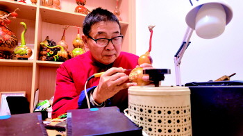 以烙铁为笔,以葫芦为纸,轻巧勾勒间,精致细腻的图案被烙烫而上,再加之渲染上色,形态各异的葫芦上不再局限于黑白,一个个五彩缤纷、造型生动的葫芦烙画作品在“守艺人”臧建手中栩栩如生。花甲之年的他,已与葫芦烙画技艺结缘40余年,《孔子讲学图》《绿度母》《春夏秋冬》……一幅幅作品见证了他在方寸之间烙画出的“大千世界”。葫芦,有着“福禄”的美好寓意,在臧建心中,葫芦烙画不再只是一项手艺,更是艺术的呈现,也是文化的传承。