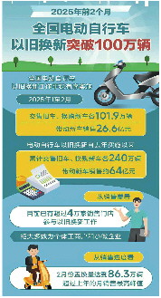 记者3日从商务部获悉,全国电动自行车以旧换新工作平稳有序实施,今年1至2月,交售旧车、换购新车各101.9万辆,带动新车销售26.6亿元。电动自行车以旧换新自去年实施以来,累计交售旧车、换购新车各240万辆,带动新车销售约64亿元。