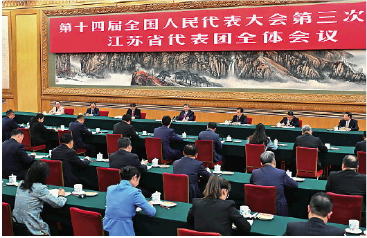 在听取大家发言后,习近平作了发言。他首先表示赞成政府工作报告,对江苏工作予以肯定,希望江苏落实好挑大梁的责任,努力取得新的更大成绩。