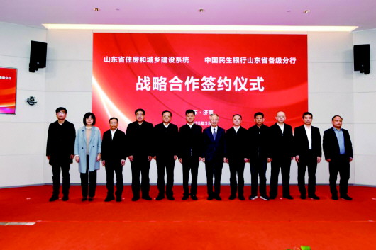 2025年3月10日下午,山东省住房和城乡建设系统与中国民生银行山东省各级分行以线上线下相结合的方式,在全省同步举行“政银企”战略合作协议签署活动,省住房城乡建设厅党组书记任海涛、中国民生银行济南分行行长黄绍辉出席并致辞,省住房城乡建设厅副厅长王润晓、中国民生银行济南分行副行长李加岭在主会场代表双方签约。