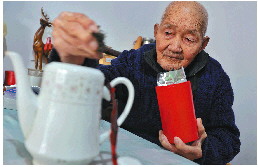 每天上午一壶茶,这个习惯老人保持了很多年。