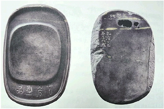 使用左手后,书法绘画以外,最急迫的还是《砚史》最后的完善。他艰难地、以尽可能少的文字在挑选的砚台上镌刻铭辞。第一年他以左手题铭刻制了七方砚台。他在其中青石砚上铭云:“臂痛力疾书”。