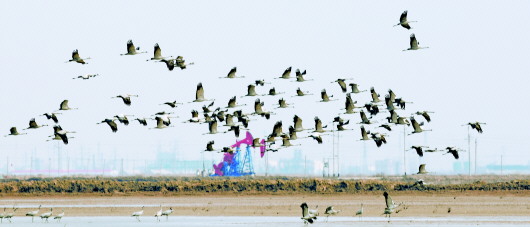 近日,一大批灰鹤来到飞雁滩油田栖息觅食。一直以来,胜利油田河口采油厂把绿色低碳贯穿油气生产全过程,油区生态环境持续向好,河口油区的飞雁滩等油田每年都吸引众多珍稀鸟类前来栖息繁衍。