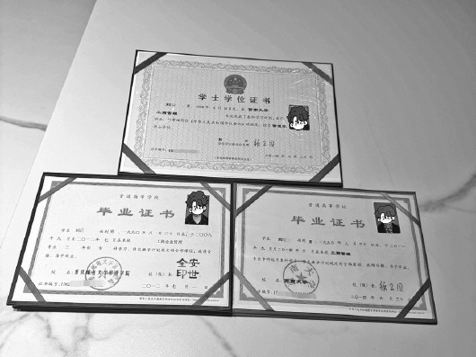 ◤刘盼的手机相册里小心收藏的专科毕业证、“211”本科毕业证及学士学位证书。