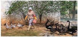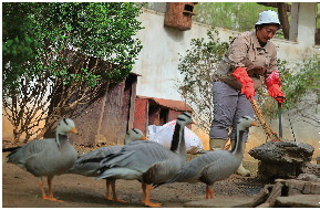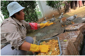 赵亮刚将饲料盘端进笼舍,“贪吃”的斑头雁就朝她走来了。