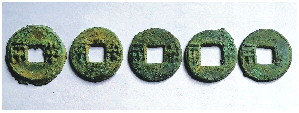 蜀国的铸币有五铢、直百五铢、太平百钱、直百、定平一百等,直百,意为一枚钱相当标准五铢钱百枚。吴国铸币有大泉当千、大泉当百,意为一枚钱相当标准五铢钱千枚、百枚。魏国铸币仍用五铢二字,没有四字钱,但轻薄了。