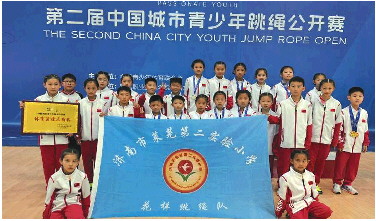 近日,由全国青少年体育联合会主办的“奔跑吧·少年”第二届中国城市青少年跳绳公开赛(莱芜站)在莱芜职业技术学院综合体育馆正式开幕。济南市莱芜第二实验小学花样跳绳队凭借顽强拼搏的精神和精湛的技术,在比赛中脱颖而出,共获得25枚金牌、16枚银牌、18枚铜牌,并荣获体育道德风尚奖,实现了运动成绩与精神文明双丰收(下图)。