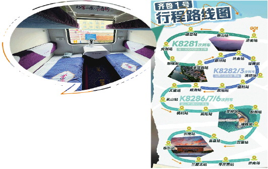 记者了解到,“齐鲁1号”旅游列车编组,共由15节车厢组成,包括3节硬座、2节娱乐功能车、2节餐饮车、2节软卧、5节硬卧车厢和1节发电车,全列载客车厢共有666个席位、铺位。列车由3条旅游线路组成,包括济南至枣庄西K8281次、枣庄西至威海K8282/3次和威海至济南K8286/7次,全程停靠22个站点,整个行程两天。