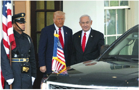 特朗普7日与到访的以色列总理内塔尼亚胡举行会谈,对媒体表示不会暂停关税政策。 新华社发