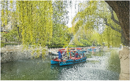 8日,记者在济南黑虎泉景区看到,三名身着荧光服的工作人员正驾驶作业船,手持喷水管向空中的柳树喷射,试图将枝头的白色绒毛打落。黑虎泉昔日“皆若空游无所依”的景观水面,此刻已成絮状物的“白色战场”。