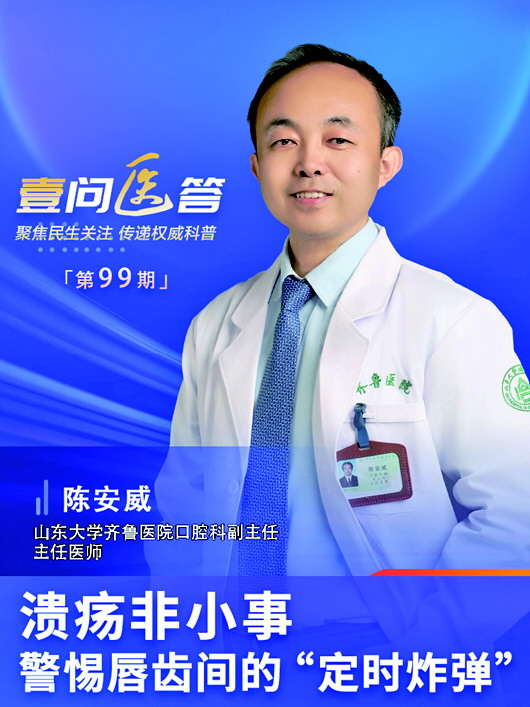 专家简介:陈安威,博士,主任医师,硕士研究生导师,山东大学齐鲁医院口腔科副主任,擅长口腔颌面头颈肿瘤的诊断治疗、口腔颌面部缺损的修复重建、牙颌面畸形的正颌外科治疗。