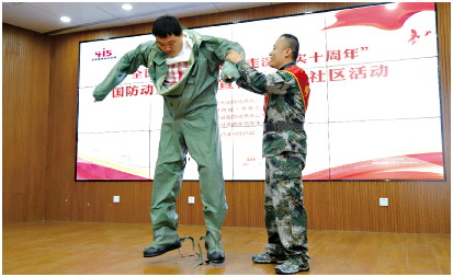 “穿防化服大家要记住一个口诀,就是‘卸、展、穿、戴’。”工作人员讲解道,穿防化服一共有四个步骤,每一步都必不可少。工作人员向现场居民讲解着防化服的穿戴过程和技巧,不少居民边看边录视频。“第一次接触防化服和手摇警报器,亲身感受后发现里面有很多讲究,今后我会继续学习国防知识。”现场体验者分享着感受。
