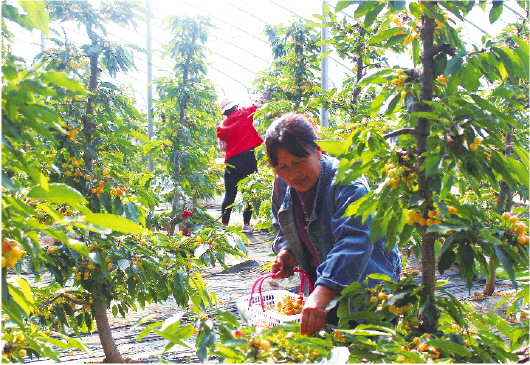 果树大本营农业设施基地项目自2020年开始分期建设。如今,基地占地860余亩,其中,大棚82座,露天樱桃80余亩,每年可收获樱桃55万斤,实现收入5600万元。同时,基地已成为全省最大的大樱桃单体设施大棚基地之一。