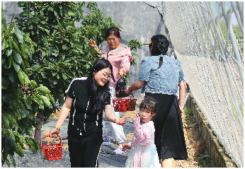 四月的日照,春和景明,日照市五莲县户部乡果树大本营农业设施基地内一片繁忙。忙做的人们手提竹筐,穿梭在田垄间,动作娴熟且小心翼翼地将一颗颗成熟的樱桃摘下,放入筐中,脸上洋溢着丰收的喜悦。与此同时,基地负责人郑德华正在和前来采购的商贩洽谈业务,言语间充满自信与热情。
