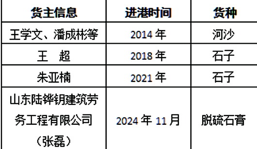 我港现对以下长期滞留货物进行公示。请货主于2025年5月31日17:00前,携身份证明、权属文件等相关材料至我港(地址:薛城区沙沟镇潘庄村枣庄港)认领,并结清相关费用。逾期未处理的,我港依法享有对该货物的处置权。