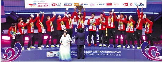 中国队在苏迪曼杯颁奖仪式上高举冠军奖杯。 新华社发