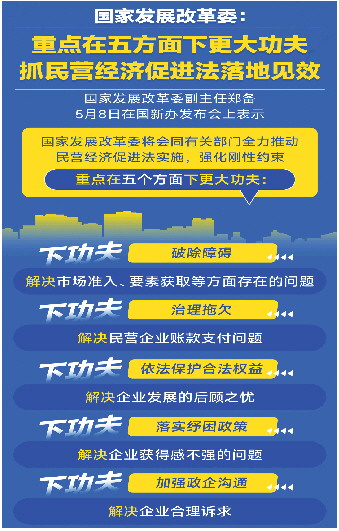 “国家发展改革委抓配套建设,已经出台如新版市场准入负面清单等,正在加快推进涉及投资融资促进、科技创新等方面配套。”郑备介绍,将会同有关部门全力推动法律实施,重点从破除障碍、治理拖欠、依法保护合法权益、落实纾困政策、加强政企沟通等五方面下功夫,努力营造促进民营经济健康发展的良好法治环境。