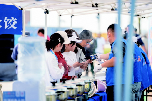 活动现场,志愿者为选手分发物资补给。辛戈 摄