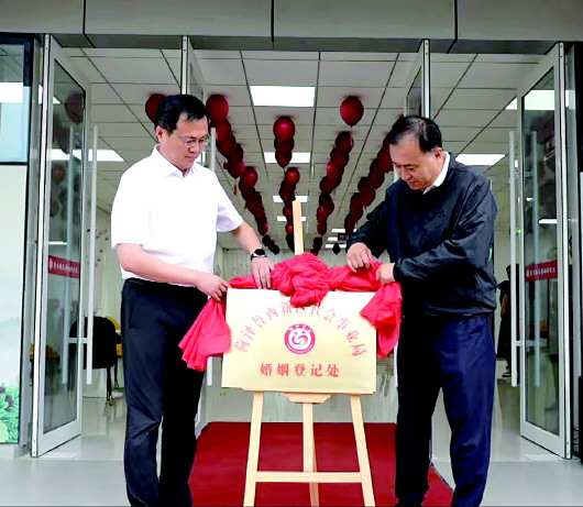 近日,菏泽市鲁西新区社会事业局婚姻登记处揭牌仪式在湘江路1999号顺利举行,标志鲁西新区社会事业局婚姻登记处正式启用,鲁西新区婚姻登记实现了“家门即办”的跨越升级。市民政局党组书记、局长、二级巡视员刘勇,市民政局三级调研员马超,鲁西新区党工委委员宋攀,鲁西新区文化和卫生服务中心主任陈承英,市妇幼保健院院长袁朝晖,以及各镇街分管负责同志和民政办主任等参加揭牌仪式。揭牌仪式由鲁西新区社会事业局局长张言国主持。仪式上,市民政局三级调研员马超宣读了《菏泽市民政局关于同意鲁西新区社会事业局婚姻登记处对外办公的批复》。随后,刘勇和宋攀分别致辞,共同为鲁西新区社会事业局婚姻登记处揭牌。他们还为两对新人颁发了结婚证,为新人们送上了美好的祝福。