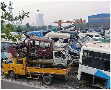 一家报废汽车回收企业内待拆解的旧车堆积如山。