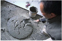 趁施工间隙的碎片时间,锈迹斑斑的铁锨是他的大号提斗(毛笔),未凝固的水泥地面就是最好的宣纸,就连盛灰浆的水瓢都能盛上水泥浆像毛笔一样挥洒自如。