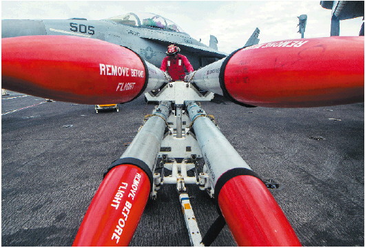1月7日,美国海军一名士兵在“卡尔·文森”号航母甲板上移动武器。 (资料片)