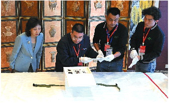 5月18日,在北京首都机场航站楼工作间内,由工作人员将文物帛书从外包装箱中取出交由国家文物局方面进行现场查验。 新华社发