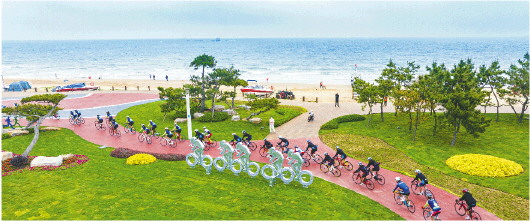 来自四面八方的骑行爱好者在日照阳光海岸绿道骑行。