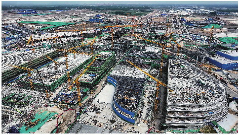 5月21日,济南机场二期改扩建施工现场机械轰鸣,数十台塔吊吊运建筑材料,施工车辆在各场区间穿梭,万余名建设者在不同点位推进工程作业。