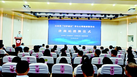 与会领导分别为山东省“守护成长”学生心理健康服务(济南站)市级总站、区县分站和首批站点学校进行授牌。