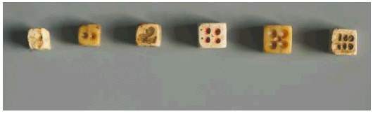 随着宋代商品经济发展,社会风俗发展,赌博作为社会风俗的一员,自然也不可避免地发生了改变,其市民化色彩愈发浓厚。作为赌博掷具的骰子到宋代时已成为一种独立的博戏。李清照《打马图经序》中载:“打揭、大小猪窝、族鬼、胡画、数仓、赌快之类皆鄙俚不经见”。“猪窝”便是当时骰子戏的俗称,李清照称其“鄙俚”,可见当时“猪窝”主要流行于平民阶层。再到南宋遗老周密在《癸辛杂识》中提及宋理宗喜欢观看他人赌博之事:“闻理宗朝春时,内苑效市井关扑之戏,皆小瑺互为之,至御前,则于第二、三扑内供纯鏝骰钱,以供一笑。”关扑就是当时对赌博的称谓,可见当时连帝王对此活动都喜爱有加,更何况费县城中的官员市民了。费城遗址出土的骰子有瓷土质和骨质两种,虽然大小不一,但形制、内容与现代骰子无异,有些点中涂抹的红色尚存。