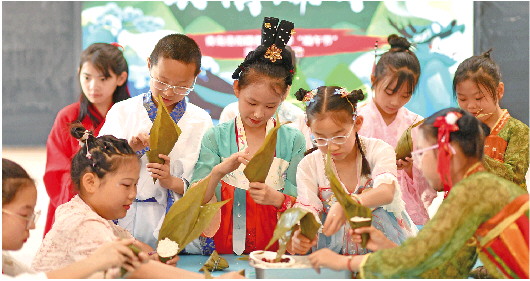 端午临近,各地群众包粽子、赛龙舟、做香囊等,在丰富多彩的民俗活动中迎接传统节日。 图为5月27日,在青岛市市北区洛阳路第二小学开展的“浓情端午”主题活动中,学生们学习包粽子,体验端午节传统习俗,并庆祝“六一”儿童节。