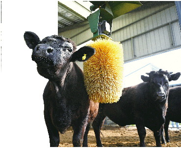 走进阳信县亿利源5G数字化牧场,牛棚里的音乐声不绝于耳。炎热的夏天已然到来,牛棚里的风扇也都转了起来。牛儿有的在软床上吹着风舒适躺卧;有的把头探出栏杆外吃饲养员刚刚撒好的饲料;有的则漫步到滚动刷旁边“自助”洗澡、按摩。这些享受着“VIP”待遇的鲁蒙黑牛是经过多年研究培育的阳信“活特产”——通过引进新西兰安格斯黑牛,与当地的鲁西黄牛、渤海黑牛进行杂交培育,阳信县最终培育出了肉质好、抗病性强、繁育能力佳的鲁蒙黑牛,并进行规模化养殖。