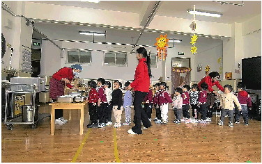 乐陵市第一实验幼儿园托班的孩子们在老师引导下排队打饭。