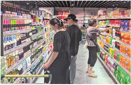 ◥消费者在超市选购饮料,大瓶装产品更受青睐。