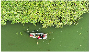 6月4日,临沂市郯城县郯城街道十里村党员志愿者在白马河湿地公园清理打捞水面漂浮物(无人机照片)。 新华社发