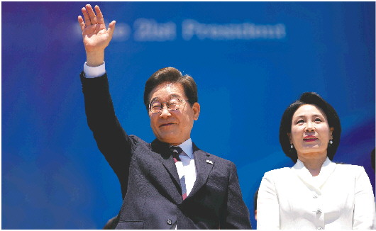 6月4日,在韩国首尔,韩国总统李在明和妻子在宣誓就职仪式结束后离开。 新华/法新