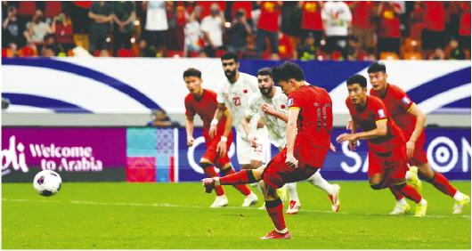 凭借王钰栋(前)主罚的点球,中国队1:0战胜阿曼。 新华社发