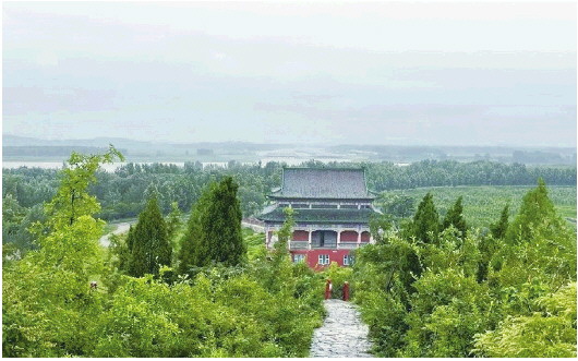 青山隐隐,绿水迢迢,站在鱼山之巅,向北眺望是一望无际的鲁西平原,沃野千里;向东南望连绵的苍山如一道屏障,翠接岱岳。山脚之下,气势磅礴的黄河在此拐了一个弯,小清河水在此汇入黄河,鱼山就在黄河的臂弯里听涛声拍岸。