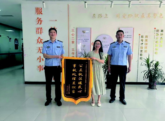 6月17日上午,市民李女士将一面写有“公正执法暖民心,事故处理显担当”的锦旗送至直属一大队事故中队办案民警手中,以此表达对中队办案民警的感激之情。