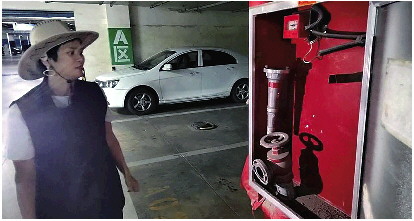 ◥地下车库内的消防栓无水,消防箱内也没有水带。