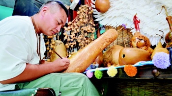 “烙刻葫芦的技法分为两种。一种是用大、中、小三种特制的钢针,在葫芦表皮上,以纤细的线条阴刻出所要描绘的山水、花卉和人物,然后上色,使线条变得更为明显;而另一种则是运用刻刀将葫芦的壳镂空,以粗犷的空隙线条勾勒出描绘的山水、花奔和人物。”对于葫芦烙画技艺,刘龙侃侃而谈。