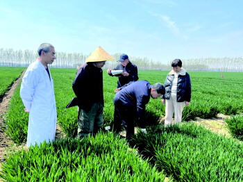 乡村振兴合伙人宁红娣指导小麦田间管理,查看小麦生长情况。