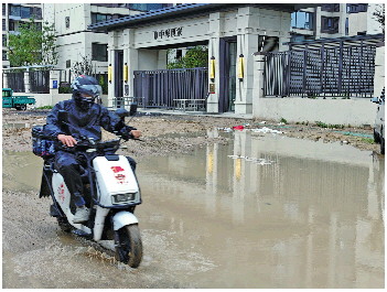 采访期间,有居民骑车路过时选择汽车压过的车辙骑过泥泞,不光要减速慢行,还要双脚离地随时准备撑住电动车,有的电动车被泥泞陷住还要双脚发力帮助电动车脱困。