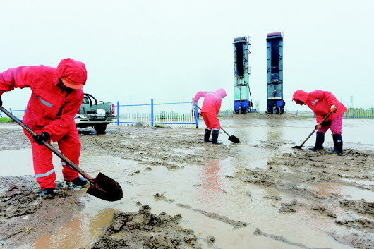 近日,受持续降雨影响,胜利油田河口采油管理四区部分油井井场进井路出现积水现象,严重影响生产车辆通行。401站党员突击队迅速集结,员工群众积极参与,大家携带铁锹、水泵等工具,高效配合确保作业安全有序。经过数小时奋战,井场进井路积水被全部排干,道路恢复畅通。