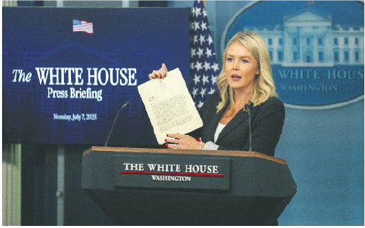 7月7日,白宫新闻发言人莱维特在记者会上展示美国总统特朗普致日本首相的信函。 新华社发