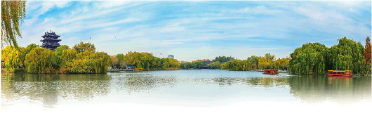 时下,人们并不满足于观山看水,最好能提供“情绪价值”。下午游览大明湖,苏老师边介绍边考我:大明湖边石碑上的“明”字为何多了一横,而趵突泉的“趵”字却少了一点?见我兴趣大增,她很快就自问自答:官方说法是清朝时避讳“明”字,民间解释为趵突泉的水流向大明湖,自然一少一多。事实上,大明湖的水来自上游的诸多泉眼,趵突泉只是其中一支流。站在大明湖畔,放眼望去,水凝碧绿,如绸似缎,平展数里。游鱼往来,荷叶亭亭,芦苇环湖,杨柳垂依。一圈走下来,大抵需要两小时。苏老师指着湖对岸一座耸于众木锦绣中的古楼,说那就是著名的“超然楼”,其命名灵感来源于宋代文豪苏轼的“超然台”。在超然楼下边踱方步边思此事,标识牌上标注的“曾堤”,让我一时没有反应过来。登上南丰桥时,才猛然想起,唐宋八大家之一的曾巩跟济南有着很深的渊源。