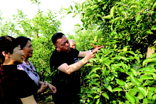专家在观水镇家庭农场示范园推广苹果免套袋技术。