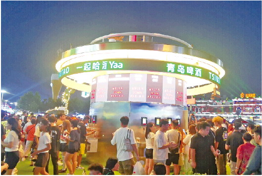 7月18日晚,第35届青岛国际啤酒节在青岛西海岸新区金沙滩啤酒城正式开幕。据悉,本届啤酒节为期30天,布局七大功能分区和七大内容板块,在主题氛围、啤酒美食、文体活动、合作交流、休闲娱乐等方面传承创新、提档升级,持续增强国际范、体验感、文化味。图为市民游客在“1903啤酒交易所”前排队打酒。 徐润杰 杨雪 李自强 摄影报道