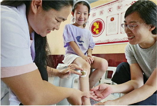 图为7月20日,在滨州市惠民县孙武街道卫生院中医馆,医务人员为小朋友免费贴“三伏贴”。 新华社发